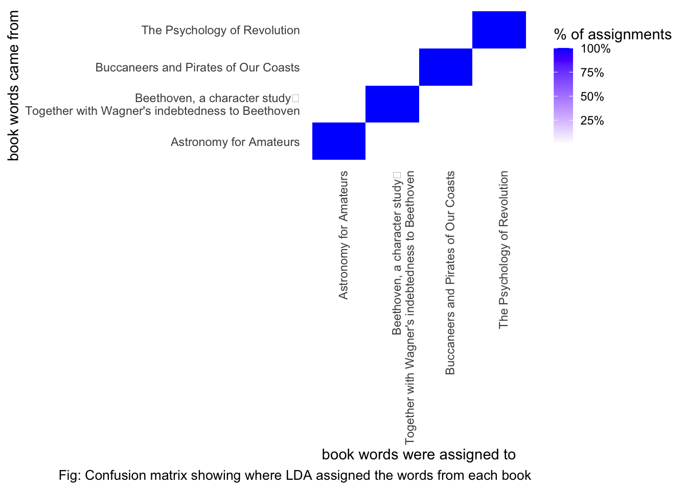 labs(caption = "Fig: Confusion matrix showing where LDA assigned the words from each book") +