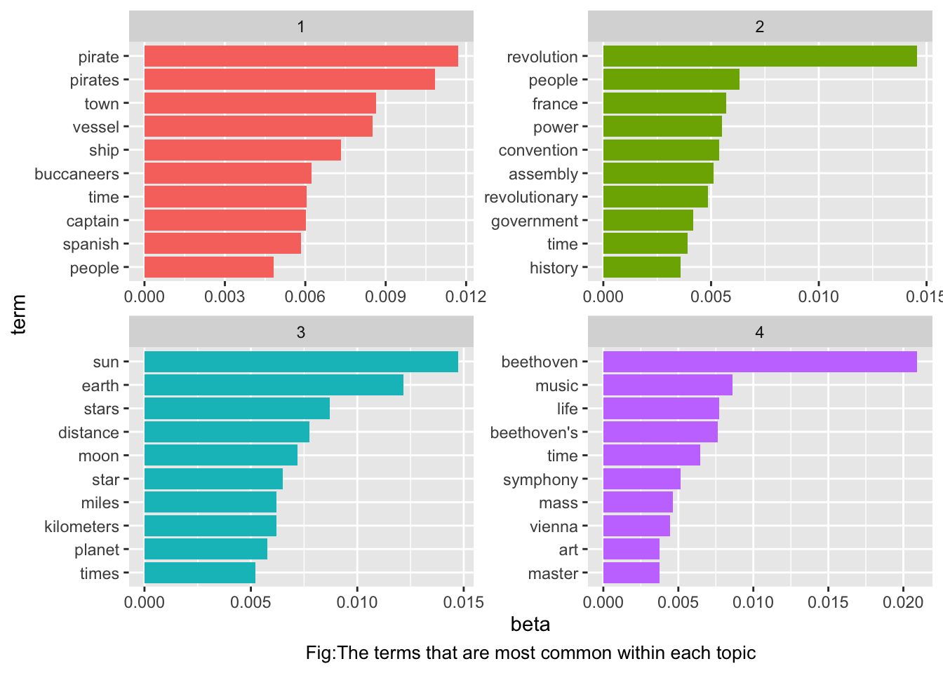 chapters_lda <- LDA(chapters_dtm, k = 4, control = list(seed = 1999))